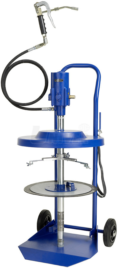 Pojízdné pneumatické mazací přístroje pro plastická maziva v baleních/kbelících 50 kg (Ø 335 - 385 mm) jsou vybaveny vynikajícím pneumatickým vysokotlakým čerpadlem na plastická maziva (mazací tuky) 50:1. Jeho patentovaná konstrukce poslední generace garantuje extrémně dlouhou životnost, vysoký výkon, malou hlučnost a zcela mimořádnou spolehlivost i za nejtěžších provozních podmínek. Má minimální počet pohyblivých dílů, což usnadňuje případný servis.Tyto přístroje se používají pro mazání plastickými mazivy až do klasifikace NLGI 2. To jsou tzv. "normální" mazací tuky, jejichž konzistence odpovídá například arašídovému máslu. Typické použití: autoservisy, rychloservisy, závodové opravny, servis stavebních a zemědělských strojů, servis armádní mechanizace.