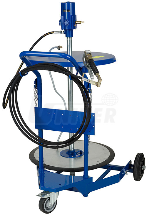 Pojízdný pneumatický mazací přístroj pro plastická maziva až do klasifikace NLGI 2 v sudech 200 kg s čerpadlem 50:1, výdejní vysokotlakou hadicí a mazací pistolí.- uplatní se zejména v autoservisech, při servisu stavebních a zemědělských strojů, servisu armádní techniky, v průmyslu, údržbě atd.