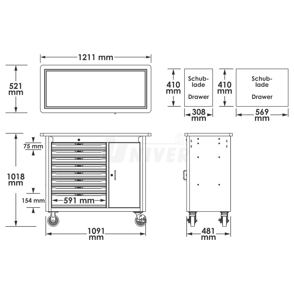 Pojízdný pracovní stůl vybavený 375-dílnou sadou nářadí, se 7 nízkými a 1 vysokou zásuvkou s centrálním zamykáním a s uzamykatelnou skříňkou.- vrchní deska z kvalitního dřeva se záchytnou drážkou