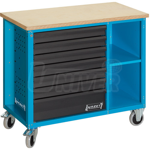 Vysoce kvalitní, pojízdný pracovní stůl HAZET 177 W-7/169 (vyrobeno v Německu) z kvalitního ocelového plechu má oboustranně na kuličkových ložiscích výsuvné zásuvky s nosností 20 kg na zásuvku, celkové dovolené zatížení dynamicky 500 kg (staticky ve stojícím stavu 700 kg), vrchní pracovní desku dřevěnou typu Multiplex o síle 30 mm s odolnou povrchovou úpravou, 4 větší kolečka s tvrzenou pryží (2 říditelná s brzdou), umožňující snadné přejíždění nerovností, centrální zamykání, vypalovaný lak a mnoho možností pro upevnění příslušenství (např. koš na papíry, držák sprejů, samonavíjecí buben s kabelem atd.).Pojízdný pracovní stůl HAZET 177 W-7/169 má 6 nižších, 1 vyšší zásuvku a také 2 odkládací plochy v pravé regálové části stolu. Do zásuvek lze ukládat moduly s nářadím HAZET. Jako volitelné příslušenství lze dodat dvířka k pravé regálové části stolu.
