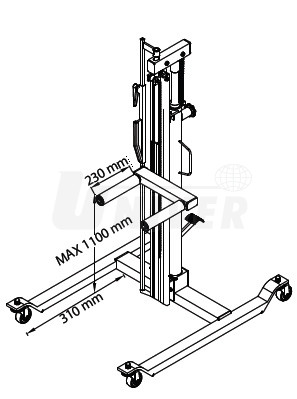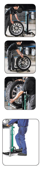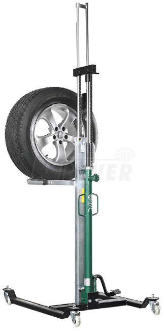 Pojízdný zvedák pro snadný a bezpečný převoz, montáž a demontáž kol s hmotností až 60 kg a průměru max. 820 mm.