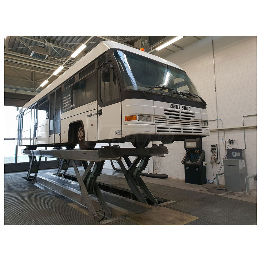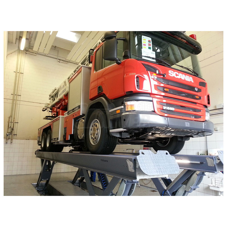 Elektrohydraulický plošinový zvedák polonůžkový (Y-tec) s nosností 25 t / 36 t s plošinami délky 10000 mm pro zvedání i těžkých užitkových automobilů..- nosnost 25 t, příp. 36 t při symetrickém zatížení, se 2 zvedacími plošinami délky 10000 mm