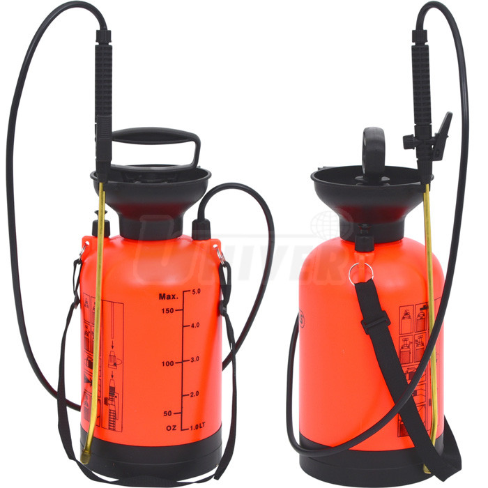 Rozprašovač s tlakovou pumpičkou a zásobníkem 5 l, hlava z nerezové oceli s možností nastavení a uzavření, hadice 1,25 m.- vhodný pro různé chemikálie, mycí a čisticí prostředky, ředidla apod.
