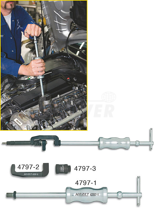 Přípravek pro demontáž pevně usazených vstřikovačů Common-Rail bez nutnosti demontáže hlavy válců se používá u naftových motorů např. Mercedes-Benz CD 611, 612, 613 atd. Skládá se z demontážního přípravku s kluzným vytahovacím kladivem (HAZET 4797-1) a čelisťového úchytu vstřikovačů M16x1,5 (HAZET 4797-2). Přípravek se osvědčil zejména v zúžených pracovních prostorech.Adaptéry: