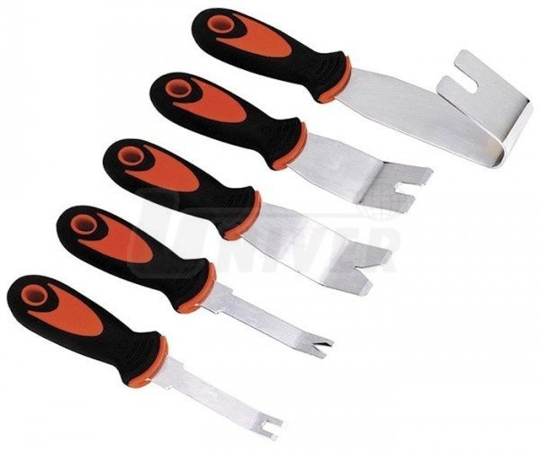 5-dílná sada speciálních přípravků z nerezoceli slouží především k rychlé, snadné a šetrné demontáži čalounění a dalších interiérových součástí bez jejich poškození. Různě tvarované konce nástrojů umožňují univerzální použití na odstranění většiny druhů spon. Dvoukomponentní ergonomicky tvarované rukojeti s otvorem pro zavěšení.Objednávka zboží