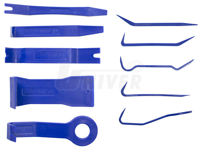 5-dílná sada přípravků pro demontáž plastových příchytek čalounění a ozdobných lišt bez poškrábání navazujících ploch.- praktická sada 5 přípravků pro demontáž čalounění vozidel