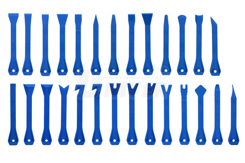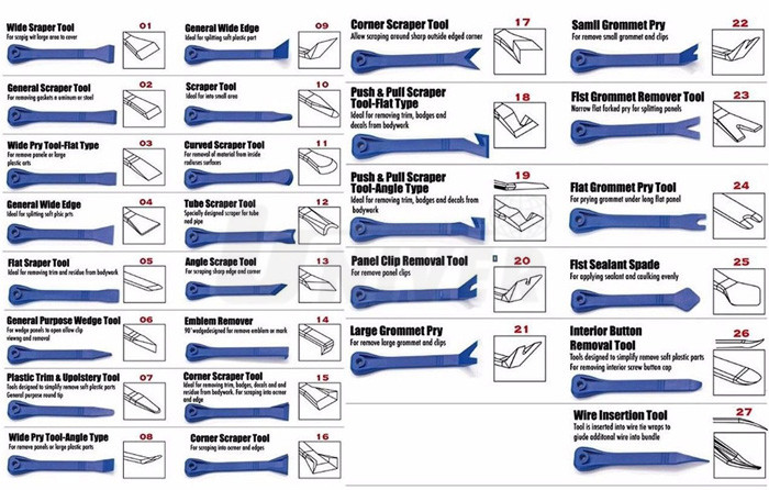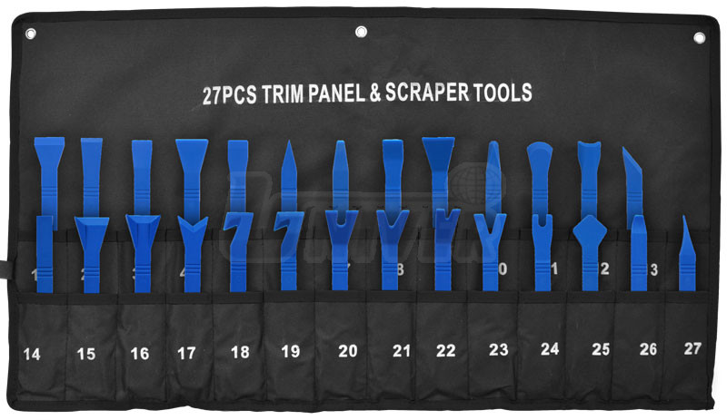 27-dílná sada přípravků v plastovém vaku pro demontáž plastových příchytek čalounění a ozdobných lišt a také různých škrabek pro odstraňování těsnění, zbytků lepidel apod.- praktická sada 27 přípravků pro demontáž čalounění vozidel, z toho 11 různých škrabek