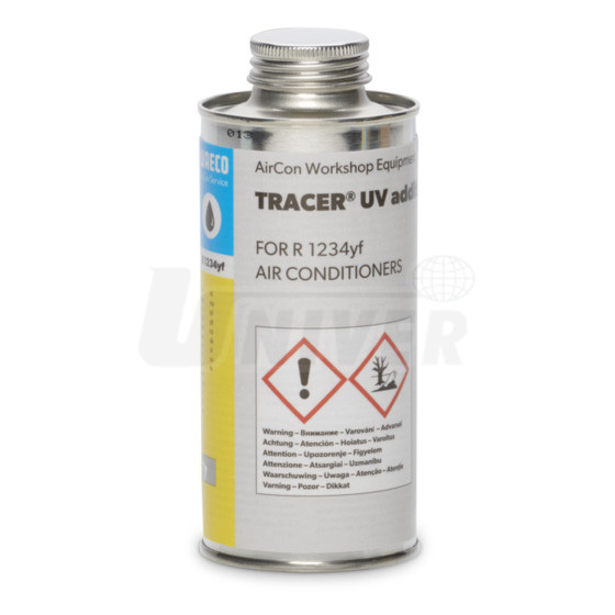 Přísada pro zjišťování netěsností v klimatizačním systému s chladivem R1234yf a olejem PAG v nádobce 250 ml.