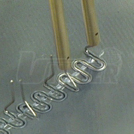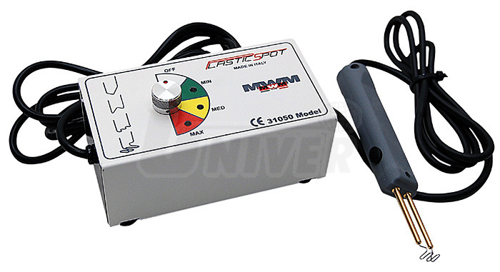 Přístroj pro snadné a stabilní opravy prasklin plastů MWM Plastic Spot 31050 vysoké kvality (Itálie) představuje novou technologii, která má všestranné použití při opravách prasklin plastů nejenom v autoservisech, v autokarosárnách a v autolakovnách.Přístroj má skříňku s knoflíkem pro regulaci žhavicího proudu (3 stupně: MIN / MED / MAX), spojovací kabel a držák žhavených kovových sponek se spínačem. Držák je vybaven dvěma trubičkami pro nasazení sponky příslušného tvaru prostým zastrčením a to buď shora nebo i z boku. Po stisknutí tlačítka držáku se sponka přiložená přes prasklinu na rubové straně plastového dílu velmi rychle ohřívá a během několika sekund se začne ponořovat do nataveného plastu. Podle tloušťky plastu se takto zataví milimetr i více do plastu a jakmile je tohoto stavu dosaženo, žhavení se vypne. Opět se několik málo sekund počká až natavený plast kolem sponky vytvrdne, držák se od sponky oddělí a sponka zůstává zatavená v plastu.