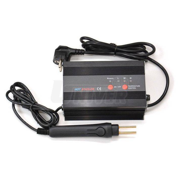 Přístroj pro snadné a stabilní opravy prasklin plastů nejenom v autoservisech, v autokarosárnách a v autolakovnách.- přístroj má držák se dvěma trubičkami pro nasazení sponky příslušného tvaru prostým zastrčením a to buď shora nebo i z boku, po stisknutí tlačítka držáku se sponka přiložená přes prasklinu na rubové straně plastového dílu velmi rychle ohřívá a během několika sekund se začne ponořovat do nataveného plastu, podle tloušťky plastu se takto zataví milimetr i více do plastu a jakmile je tohoto stavu dosaženo, žhavení se vypne, opět se několik málo sekund počká až natavený plast kolem sponky vytvrdne, držák se od sponky oddělí a sponka zůstává zatavená v plastu