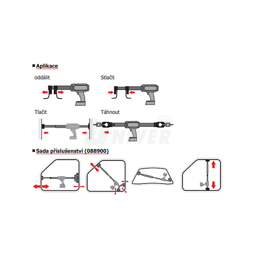 - sada s obsáhlým rovnacím příslušenstvím pro tah i tlak ve druhém kufru (088900) obsahuje prodlužovací nástavce a opěrné adaptéry