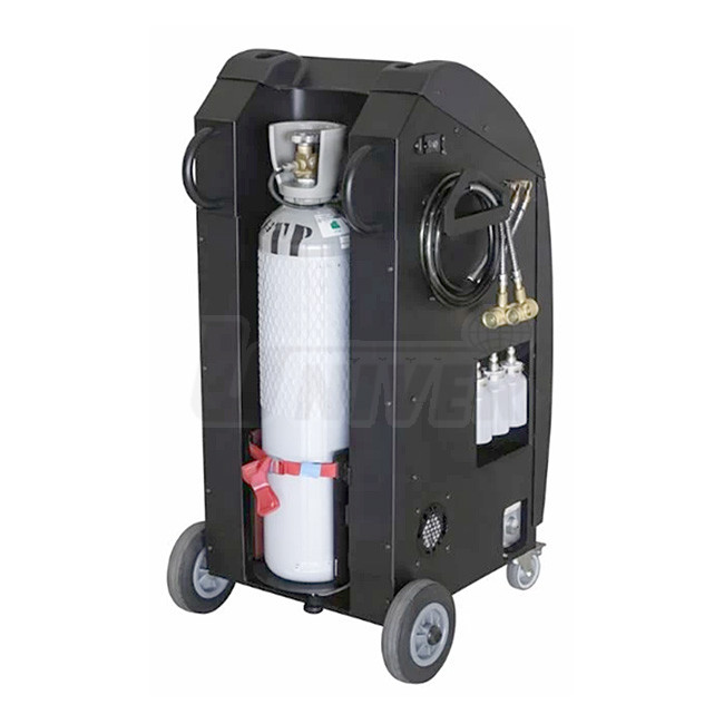 Plně automatický přístroj pro servis klimatizací s chladivem R744 (CO2) s integrovanou tiskárnou a databanku vozidel.- přístroj je konstruován s ohledem na velmi vysoké tlaky v těchto klimatizačních systémech (běžný provozní tlak se pohybuje v rozmezí 70 až 140 bar, při vysokých venkovních teplotách může tlak ve vysokotlakém okruhu dosahovat až 150–170 bar, v nízkotlakém cca 30–40 bar, při vypnuté klimatizaci se tlak srovná v celém systému a závisí na okolní teplotě, často bývá kolem 30–50 bar), systém pracuje nad kritickým bodem CO2 (31°C, 72,8 bar), což znamená, že v kondenzátoru (plynovém chladiči) nedochází ke kondenzaci, ale chladivo zůstává v plynné fázi pod vysokým tlakem, kvůli extrémním tlakům musí být všechny součásti (hadice, kompresor, kondenzátor) speciálně konstruovány a dimenzovány, aby vydržely tlaky přesahující 130 bar