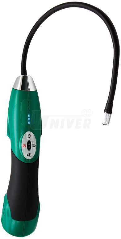 Elektronický přístroj je konstruován zejména pro zjišťování místa i nepatrného úniku chladicího prostředku R134a (příp. R12/R11/R500/R503/R22/R123/R124/R502/R404a/R410a, R407c atd.) ze systému klimatizace automobilu. Ohebná měřicí sonda na konci se snímačem umožňuje zjišťovat přítomnost uniklého chladicího prostředku na halogenové bázi i v obtížně přístupných místech. Nastavit lze celkem 7 stupňů citlivosti. I na nepatrnou koncentraci chladicího prostředku odpovídající úniku 3 g za rok reaguje přístroj změnou barev LED diod na panelu a zároveň akustickou změnou základního pípání. To usnadňuje postupné přibližování se k místu úniku. Měření a vyhledávání netěsnosti optimalizuje také automatické nulování a resetování tlačítkem upravujícím úroveň detekce uniklého chladiva.Praktickou součástí přístroje je indikace stavu snímače i indikátor napětí baterií se 3 LED (modrá=plné napětí, fialová=dostatečné napětí, červená=baterie nutno dobít). Potřebu výměny snímače signalizuje nestálý, proměnlivý výstražný zvuk.