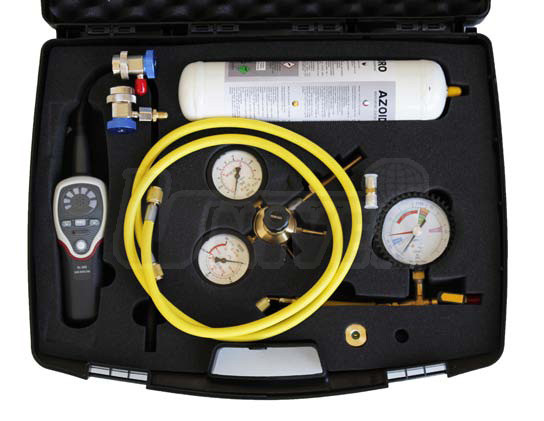 Elektronický přístroj / sada pro zjišťování i nepatrného úniku chladiva ze systému klimatizace automobilu pomocí směsného plynu 95 % dusíku (N2) a 5 % vodíku (H2).- základem sady je přístroj pro zjišťování i velmi malého množství chladiva R134a nebo R1234yf ze sytému klimatizace pomocí směsného plynu (směs 95 % dusíku a 5 % vodíku, v SRN označovaný jako "Formiergas")