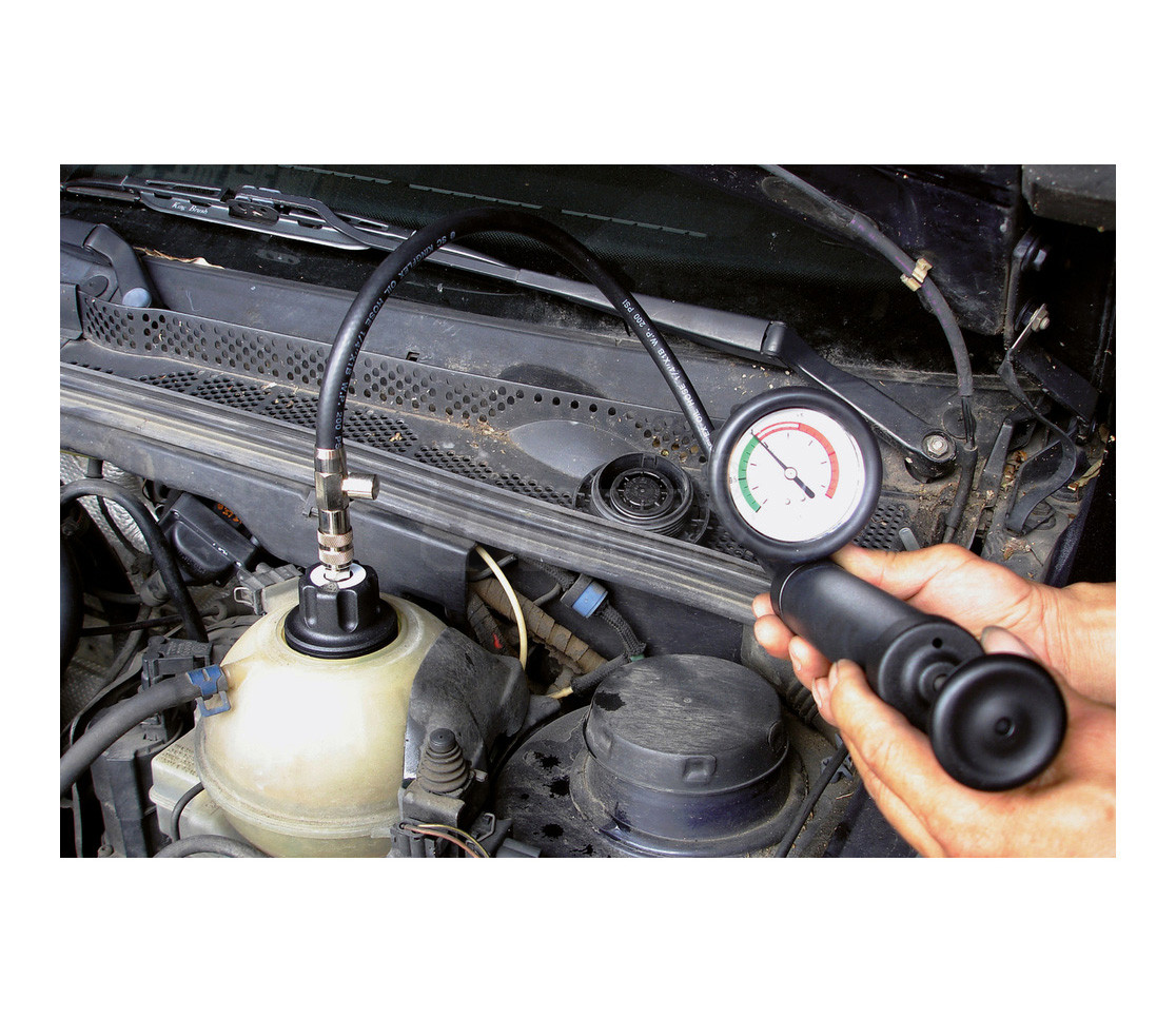 Přístroj pro zkoušení chladicích systémů a vyhledávání netěsností v nich s ruční pumpou s tlakoměrem 0 - 2,5 bar, teploměrem a adaptéry.- ideální sestava k tlakové zkoušce chladicího systému a uzavíracích víček