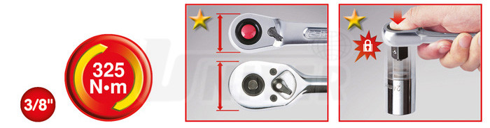 Přepínací ráčna 3/8" má extrémně štíhlou hlavu, řechtačkový mechanismus s jemným ozubením (72 zubů) a tlačítko pro rychlé uvolnění.- přepínací ráčna SlimPOWER