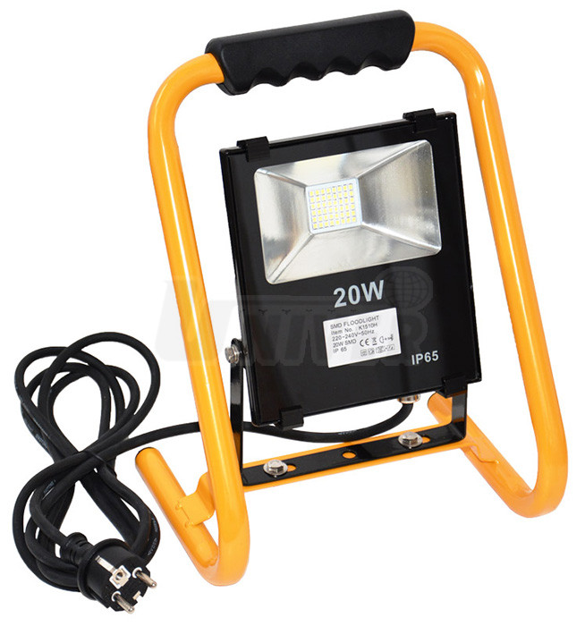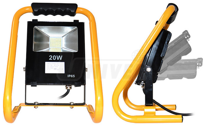 Malý, ale výkonný přenosný reflektor SMD 20 W pro vnitřní i venkovní použití (IP65) se stojanem a přívodním kabelem 3 m.- SMD LED s extrémně vysokou životností