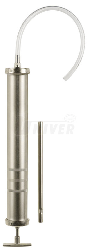 Ruční plnička a odsávačka olejů až do SAE 90, nafty, LTO, petroleje, nemrznoucích kapalin, brzdové kapaliny, vody do 80°C atd. má kovovou sací trubičku, průhlednou hadičku a objem 1000 ml.- ruční plnička a odsávačka kapalin v poniklovaném průmyslovém provedení