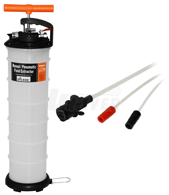 Přístroj pro ruční nebo pneumatické odsávání všech druhů olejů, vody a dalších neagresivních kapalin s nádobou 6 l, včetně 3 odsávacích trubiček Ø 9,8/6,7/5,8 mm.- snadné ruční (není-li k dispozici přívod stlačeného vzduchu nebo stačí jen vytvoření podtlaku pumpováním) nebo komfortnější pneumatické odsávání všech druhů olejů (motorových, převodových atd.) z motorů a převodovek automobilů, motocyklů, lodních motorů, stacionárních motorů, zahradních traktorů, sekaček trávy apod.) a rovněž brzdové kapaliny, nemrznoucích kapalin atd.