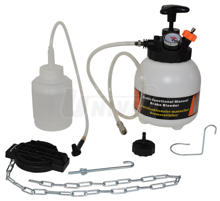 Sada pro odvzdušňování brzdových a spojkových systémů s ruční pumpou, tlakoměrem, nádržkou 3 l, Euro-adaptérem, univerzálním adaptérem s řetězem, hadicí a záchytnou nádobou.- Euro adaptér / uzávěr se našroubuje na hlavní brzdový válec a pak spojí hadičkou s přístrojem naplněným novou brzdovou kapalinou, pak se pumpováním zásobní nádržka natlakuje a čerstvá brzdová kapalina vytlačuje starou ze systému přes odvzdušňovací šroubky postupně na všech 4 na kolových brzdových jednotkách, na odvzdušňovací šroubek se vždy připojí hadička s nádobkou pro vytlačovanou brzdovou kapalinu
