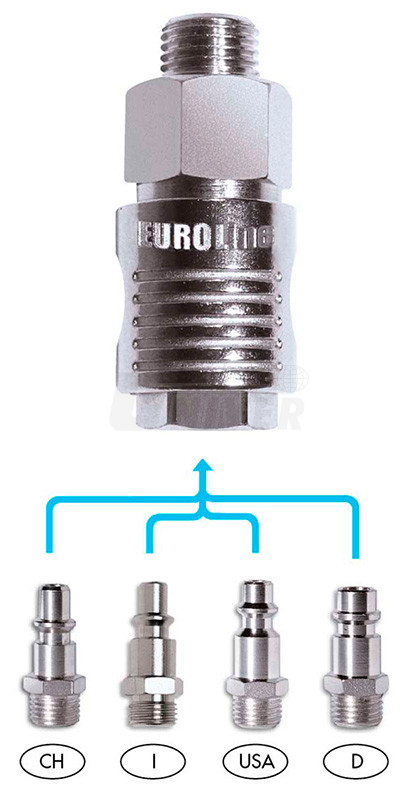 Mosazné rychlospojky na stlačený vzduch s vnějšími i vnitřními závity 1/4", 3/8", 1/2"a s připojeními na hadice.- univerzální použití pro rychlospojky typu CH (Švýcarsko), I (Itálie), USA (Spojené státy) a D (Německo)