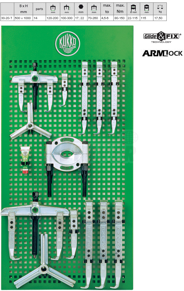 Univerzální sada 2- a 3-ramenných stahováků se standardními stahovacími háky a separátorem (oddělovacím přípravkem) na děrované tabuli 500x1000 mm německé firmy KUKKO-Werkzeugfabrik patří do nejvyšší kvalitativní třídy v Evropě.Ze 14-dílné sady lze sestavit tyto stahováky: