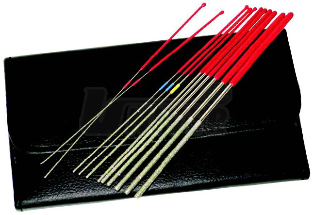 Sada (12-dílná) tyčinkových diamantových přípravků / kulatých mikropilníků pro čištění malých, kulatých samičích kontaktů konektorů.- délka mikropilníků je 127 mm a průměry činí od 0,75 mm až do 3,02 mm