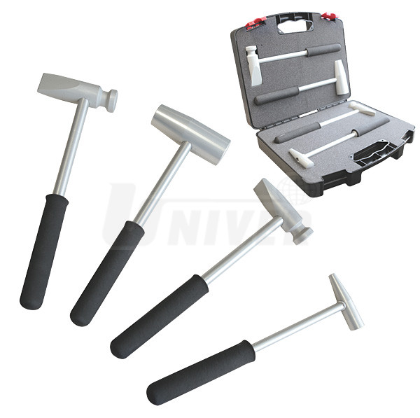 Sada 4 autoklempířských kladiv různého tvaru pro vyrovnávání hliníkového plechu GYS 020986 renomované firmy GYS (vyrobeno ve Francii) je uspořádaná v plastovém kufříku.