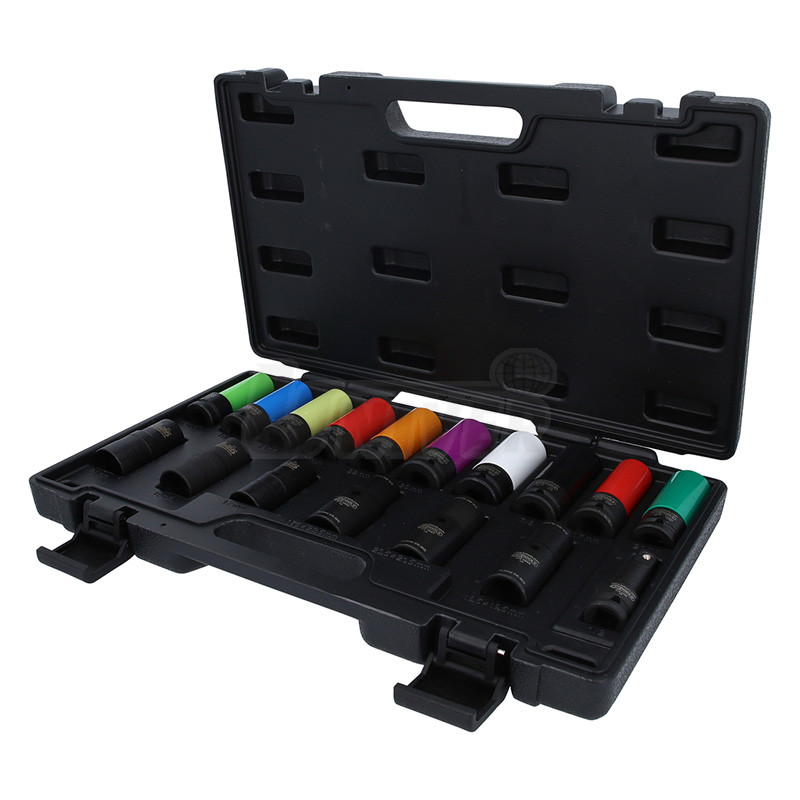 17-dílná sada obsahuje šestihranné 1/2" nástrčné kované hlavice a spirálové nástrčné hlavice k vyšroubování poškozených šroubů.- čtyřhran 1/2"