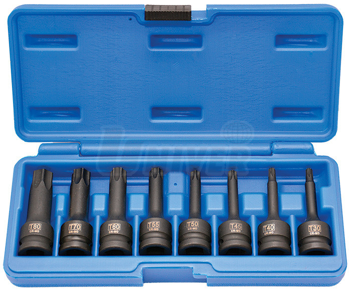 8-dílná sada kovaných prodloužených zástrčných hlavic 1/2" - TORX.Obsahuje: T30-T40-T45-T50-T55-T60-T70-T80 x 78 mm.