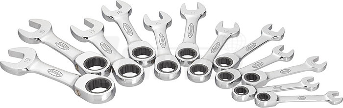 12-dílná sada krátkých očkoplochých ráčnových klíčů z kvalitního chrom-vanadia, mají leštěné hlavice, očkovou přepínatelnou ráčnu se 72 zuby a chromovaný povrch. Jsou určeny pro náročné použití zejména v obtížně přístupných místech (otočný úhel 5°).Sada obsahuje tyto klíče: