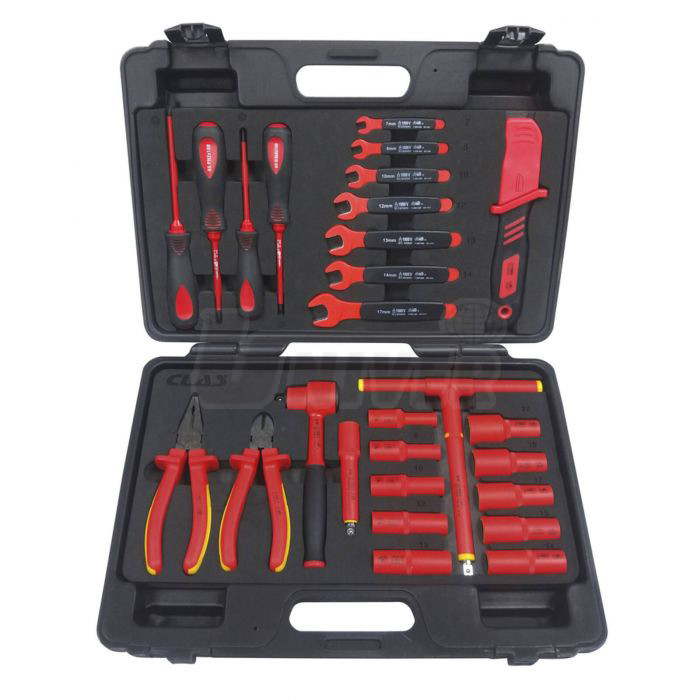 27-dílná sada izolovaného ručního nářadí pro údržbu a opravy zejména hybridních nebo plně elektrických vozidel podle normy VDE.- umožňuje bezpečnou práci až do napětí 1000 V podle normy DIN EN 60900 AC / 1000 V