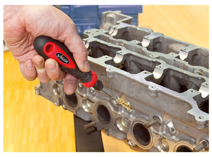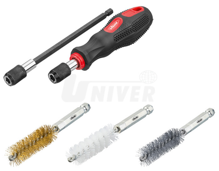 Sada ocelových, ocelových s mosaznou povrchovou úpravou a nylonových kartáčků (36 ks) pro čištění válců, trubek, pouzder apod.Pro nasazení kartáčků se použije buď rukojeť ze sady, ale kartáčky je také možné upnout do elektrické nebo pneumatické vrtačky.