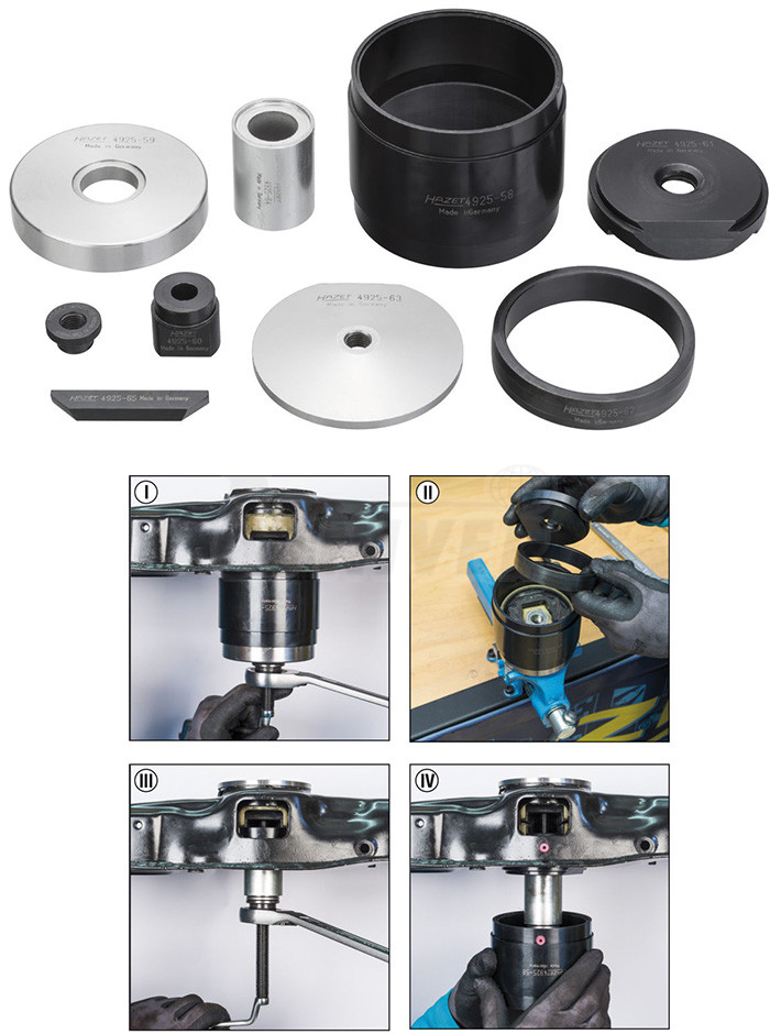 9-dílná sada přípravků pro demontáž a montáž dvojitých silentbloků v nosičích agregátů.- jednoduché ovládaní s pomocí mechanického vřetena HAZET 4925-67/2 (v této sadě není obsažené)