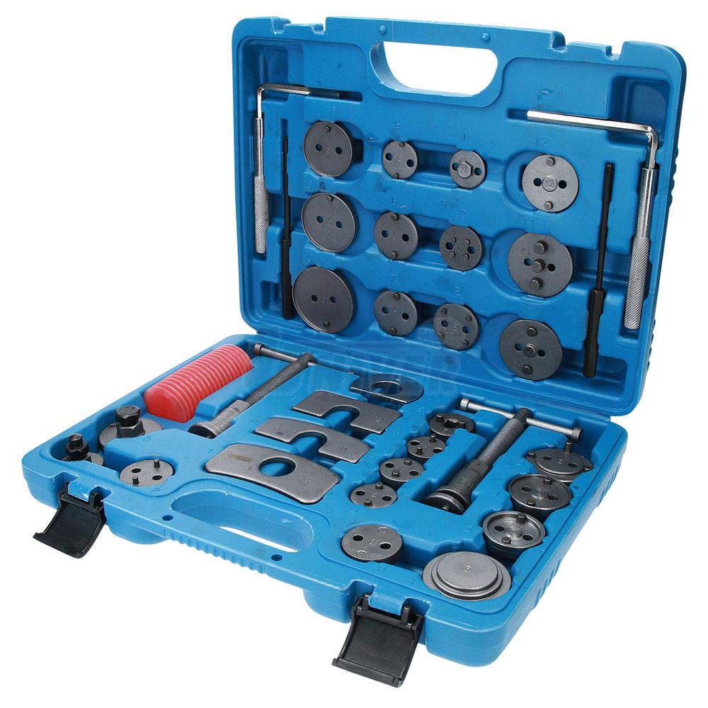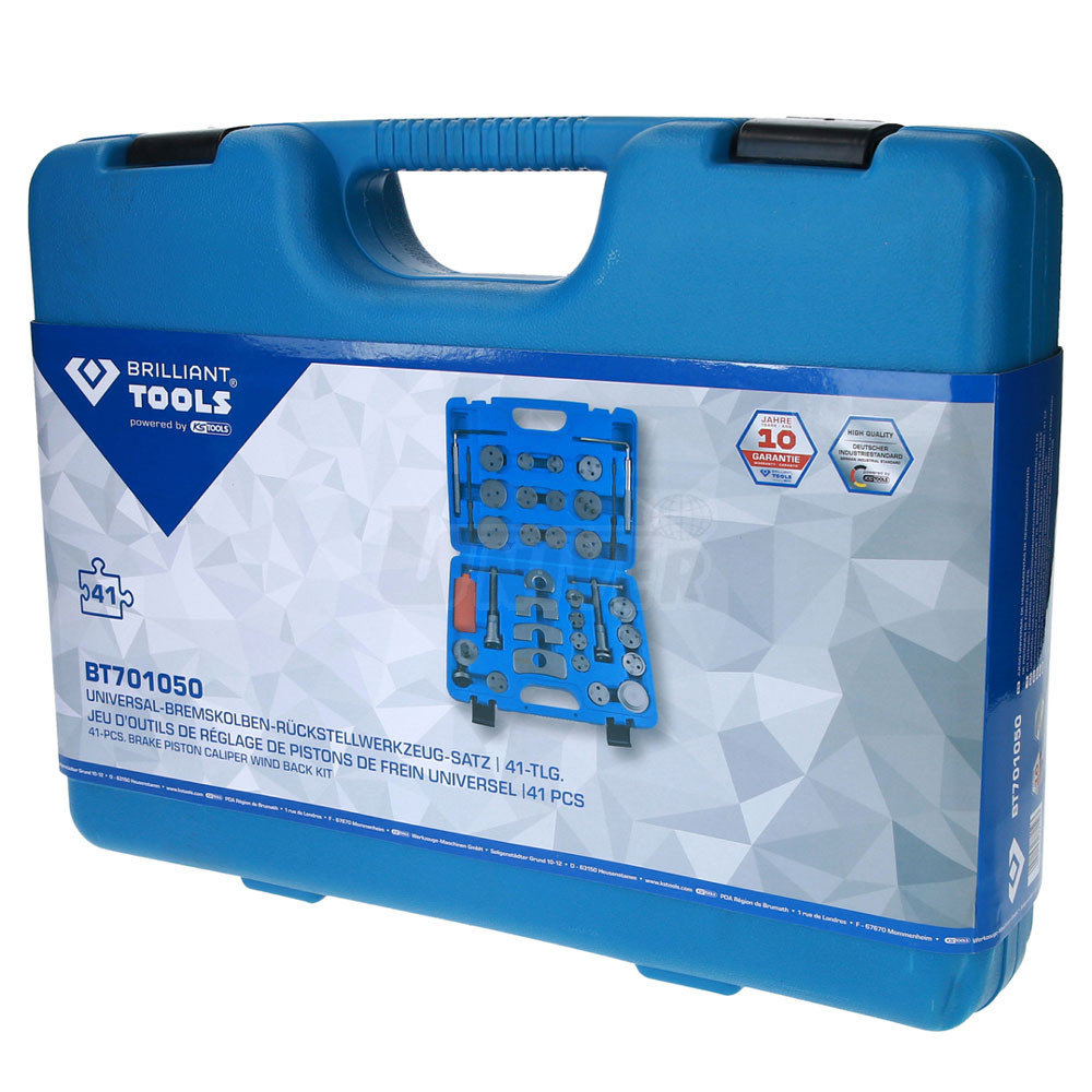 41-dílná sada přípravků pro montáž / zpětné vracení pístů třmenu kotoučových brzd v plastovém kufříku.- nový systém pro montáž / zpětné vracení levo - a pravotočivých pístků třmenů kotoučových brzd