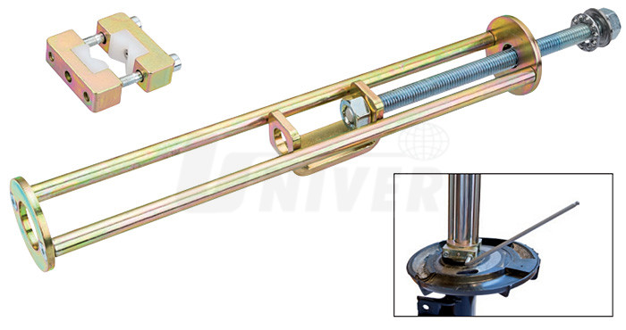 3-dílná sada pro demontáž a montáž tlumičů pérování s tažnou dorazovou pružinou. Sada obsahuje speciální základní těleso, robustní závitové vřeteno M12 se speciálním uchycením a univerzální svorku s plastovou vložkou tvaru V. Fixace prostřednictvím svorky s vložkou ve tvaru V v dorazové pozici bez poškození. Používá se zejména pro vozy BMW, Fiat, Ford, Mercedes-Benz, Nissan, Peugeot, Toyota atd.Objednávka zboží