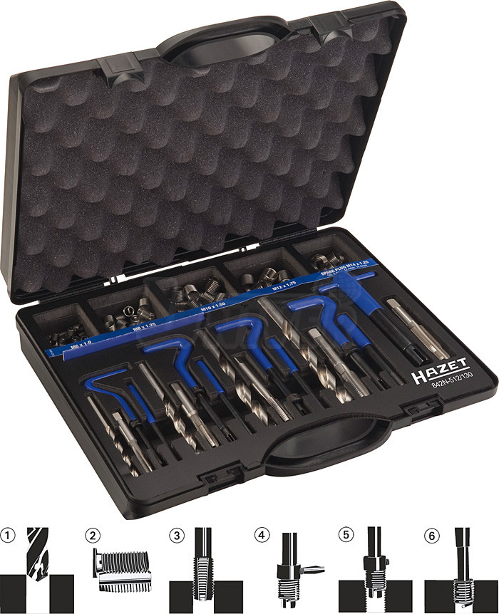 118-dílná sada pro opravy závitů M6 až M14. Opravovaný závit se nejprve odvrtá, potom se do rozšířeného otvoru nařízne závit pro opravnou závitovou vložku, ta se následně do závitu našroubuje a přebytečná část odlomí. Výsledkem je nový závit předchozího rozměru zpravidla v mnohem lepší kvalitě, než byl nový původní.Závitové vložky jsou vyrobeny vysoce kvalitní chrom-niklové Niro-nerezoceli. Opravený závit výborně odolává korozi, vysoké teplotě a mechanickému namáhání. Prakticky se neopotřebovává. Tato metoda se používá i na opravy stržených nebo jinak poškozených závitů pro zapalovací svíčky v hlavách válců spalovacích motorů.