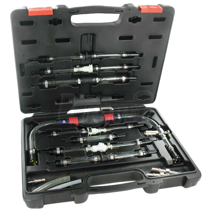 Sada adaptérů, propojovacích hadiček a spojek v plastovém kufru pro odvzdušňování / plnění palivových systémů dieselových motorů.