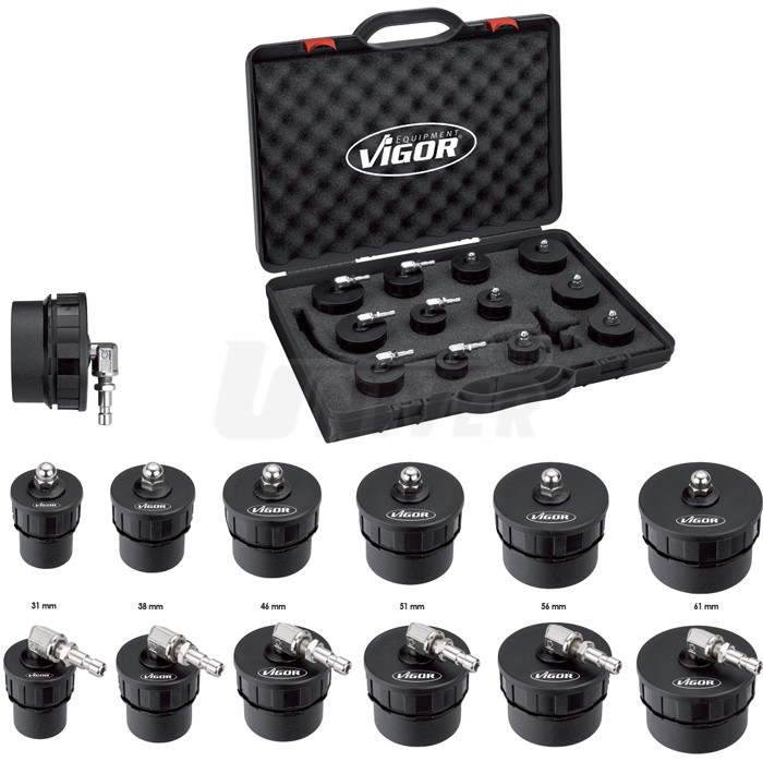 12-dílná sada přípravků / adaptérů bez tlakoměru pro zkoušení těsnosti novějších turbosystémů motorů natlakováním.Sada umožňuje rychlou diagnostiku turbosystémů motorů v automobilech novějšího provedení, kde jsou vzduchová potrubí přeplňování spojená klikacím systémem. Jedná se především o snadné, rychlé a odborné zjištění netěsností chladičů plnicího vzduchu a neviditelných trhlin v hadicích přívodu plnicího vzduchu do motorů.