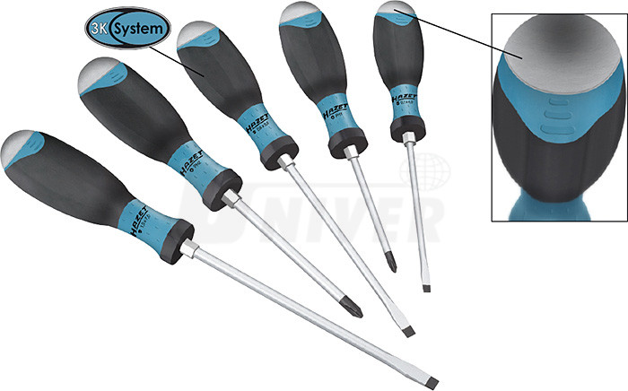 5-dílná sada šroubováků s úderovou hlavicí z vysoce kvalitního chrom-vanadia. Čepel je matně chromovaná, špička mořená. Šroubováky mají speciální tříkomponentní ergonomické rukojeti (3K System), což umožňuje vysoký přenos síly. Bez problémů také vydrží údery kladivem. Přímo u držadla má čepel šestihranný nástavec pro pomocné otáčení klíčem.Sada obsahuje tyto šroubováky:
