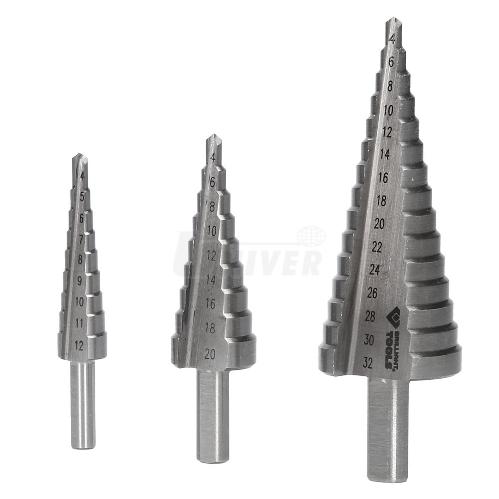 1 ks stupňovitý vrták Ø 4 – 32 mm: 4 / 6 / 8 / 10 / 12 / 14 / 16 / 18 / 20 / 22 / 24 / 26 / 28 / 30 mm
