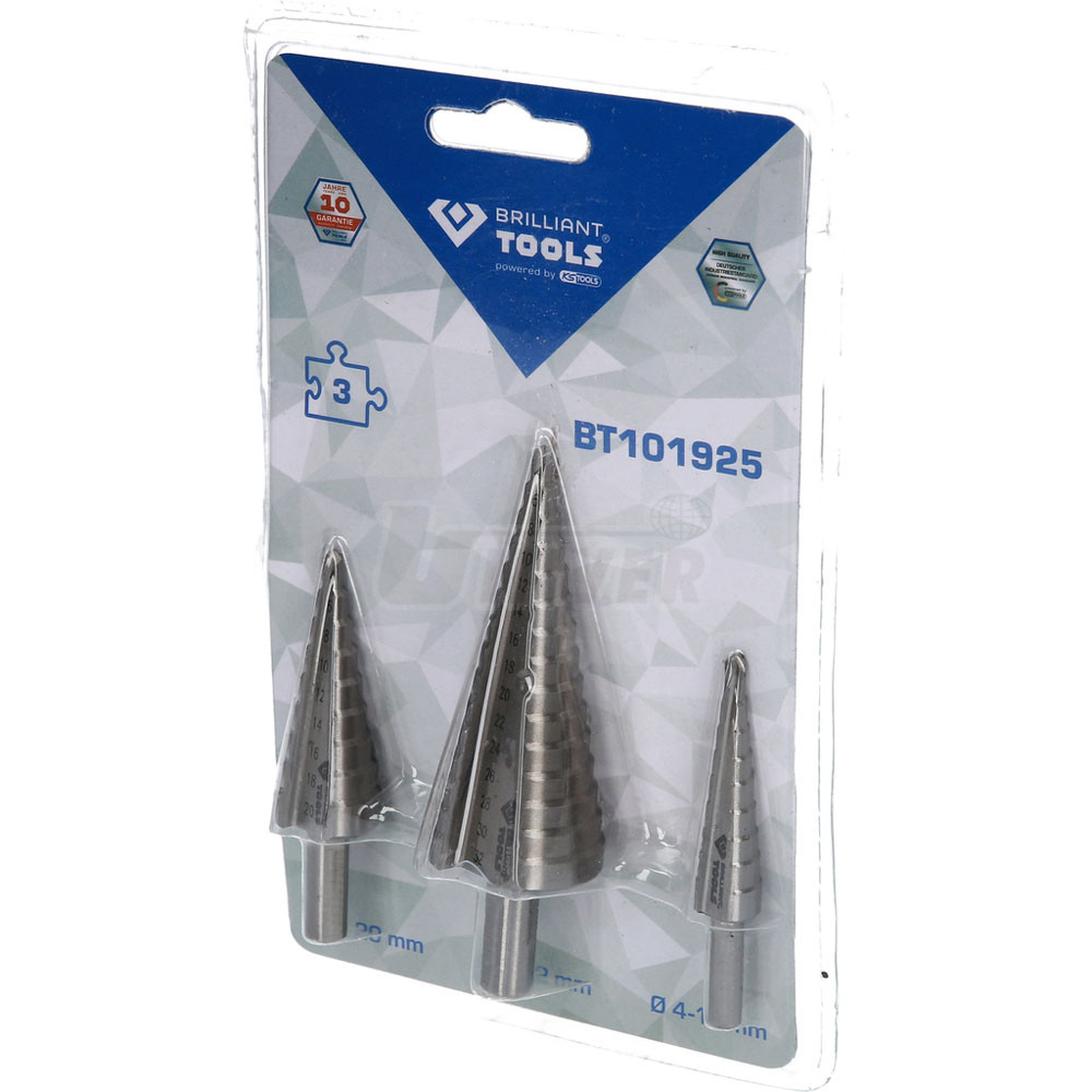 Sada 3 stupňovitých kuželových vrtáků různých průměrů pro vrtání bez předvrtávání, otřepů a deformace plechu.- 3-dílná sada různých stupňovitých vrtáků pro plynulé, bezhrotové vrtání a navrtávání přesných otvorů do plechů, plátů, trubek a profilů do síly materiálu 5 mm