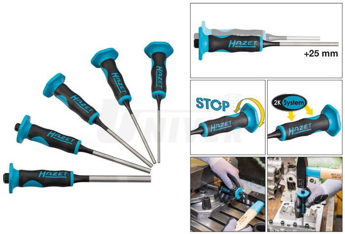 5-dílná sada vyrážečů / vytloukačů závlaček v dlouhém provedení s dvoukomponentními plastovými držadly s ochranou ruky proti zranění.