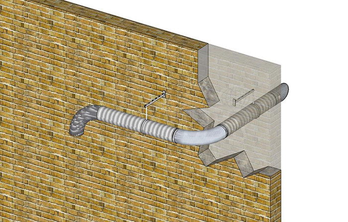 Odvod výfukových plynů motorových vozidel dl. 3 m s průchodem stěnou a horizontálním vyústěním ve venkovním prostředí.Sestava se skládá z následujících komponentů: ZGS TU (1 ks), ZGS NIP (1 ks), ZGS CR90 (1 ks), ZGS TER (1 ks), ZGS AP (1 ks), ZGS SME300 (2 ks), GTA (1 ks) a GF (2 ks).