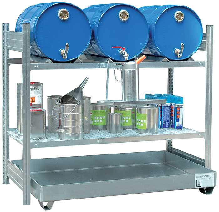 Sestava speciálního regálu a záchytné vany pro sudy s motorovými, převodovými, hydraulickými oleji a obdobnými kapalinami. Ze 3 sudů 60 l lze stáčet přes výdejní ventily uvedené kapaliny, přičemž záchytná vana na podlaze v prostoru pod sudy tvoří podstavec a brání možnému volnému úniku kapalin. Regál je vybaven roštovou podlážkou/policí pro ukládání různých nádob, kanistrů, sprejů apod.Sestava pro 3 sudy 60 l s roštovou policí: