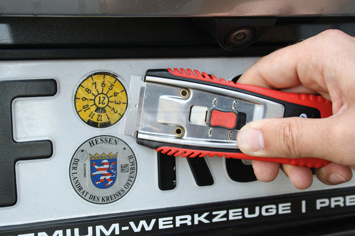 Speciální škrabka pro odstranění etiket, samolepek apod. se snadno vyměnitelnou čepelí.- snadno vyměnitelné a zasouvací čepele