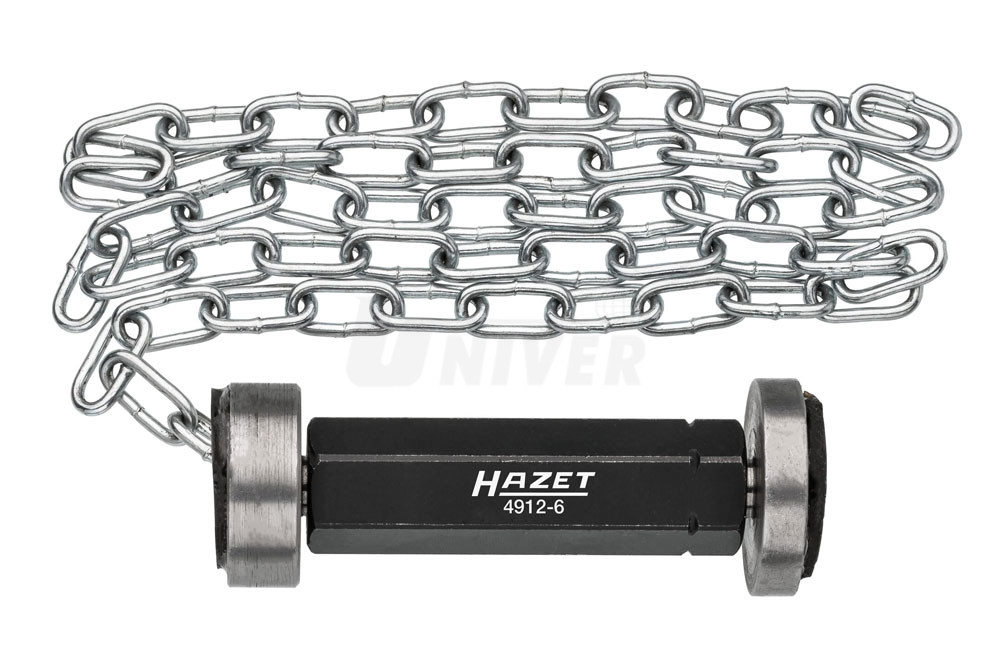 4912-6 - Podpěrné zařízení (pro práci ve spojení s HAZET 4904/6) zvlášť užitečné u vozidel s víceprvkovým zavěšením nápravy. Zabraňuje nechtěnému povytažení vozidla nahoru během procesu stahování pružin a poškození dílů vozidla. Rozsah upnutí 80 – 127 mm, průměr tlačného kusu 30 mm, délka řetězu 750 mm.