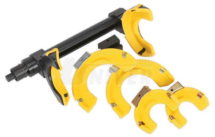 7-dílná sada kvalitních přípravků pro stahování vinutých pružin zavěšení kol McPherson Ø 80 – 195 mm.- univerzální sada použitelná pro většinu osobních a užitkových automobilů