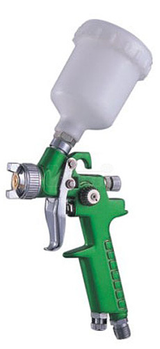 Malá stříkací pistole (HVLP) pro použití při stříkání a retušování detailů a menších ploch, plynulá regulace kruhového rozstřiku i šíře rozstřiku, vysoký výkon a jemné rozprášení lakovacího materiálu, redukce tvorby mlhoviny, použití pro různé vodou-ředitelné barvy, tryska i jehla z ušlechtilé oceli, vrchní nádobka z umělé hmoty 100 ml, standardní tryska 0,8 mm, dodávají se i trysky 0,5 až 1,5 mm, šířka nástřiku 150 mm, optimální tlak vzduchu na vstupu 2,0 - 3,5 bar, spotřeba vzduchu 226 l/min.