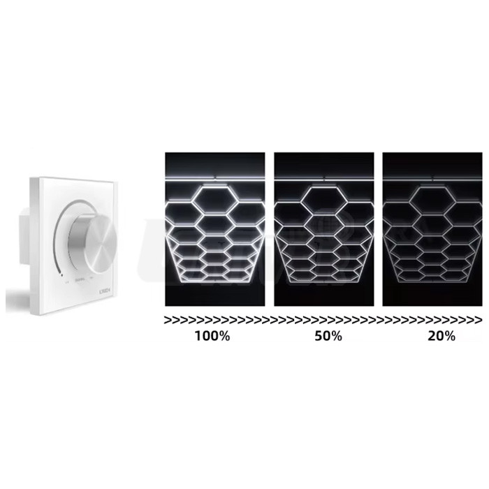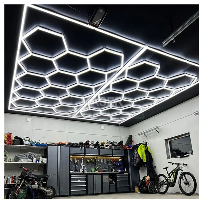 Moderní stropní LED osvětlení s vysokým světelným výkonem a plynulým stmíváním k ideálnímu osvícení autosalonů, servisních dílen apod.- šestiúhelníkový LED systém s designovou strukturou včelí plástve